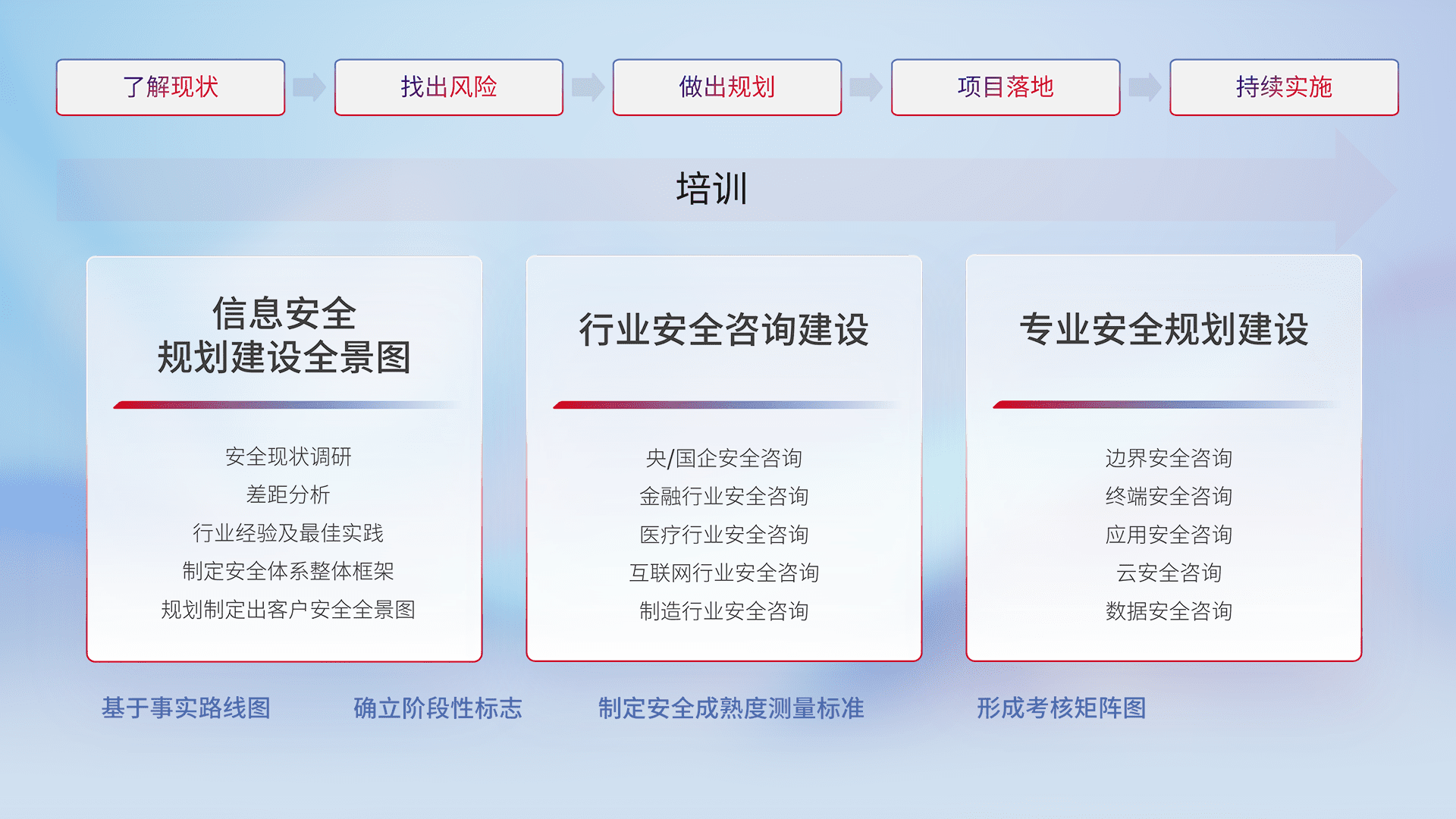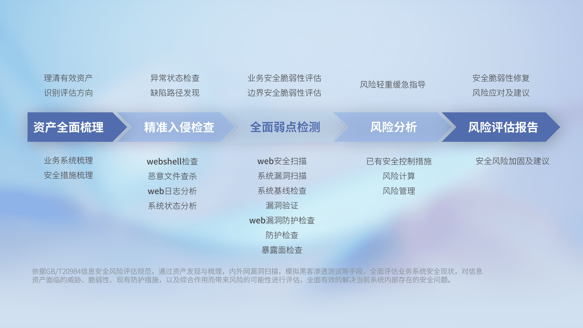 针对客户行业特性,,以专业的安全服务+多厂商联合解决方案提供专属的一站式安全管理服务,,,帮助客户全面感知网络空间威胁,,,基于识别、、检测、、分析、、防护、、、监测、、、、响应的服务理论模型,,,,从方案咨询、、、集成交付、、、、评估验证、、、优化加固、、、运维运营,,,致力于为客户提供完整的闭环管理式安全服务。。。。以实战经验为客户打造高抵御风险的安全体系,,,,帮助客户发现威胁、、、对抗威胁、、、处置威胁,,,,不断积累安全对抗能力,,,,持续保障数字化安全。。